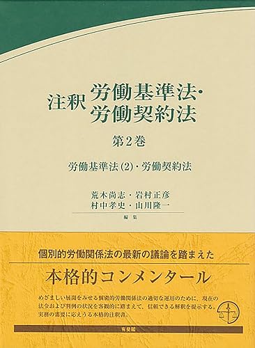 個別的労働関係法の急速かつ大規模な発展と変化のなかで,その趣旨・目的,具体的な規制内容について提起される様々な解釈論上の課題や論点について,現在の法令および判例の状況を客観的に踏まえて,信頼できる解釈を提示する本格的注釈書。本巻は,労働基準法の後半部分および労働契約法を扱う。
