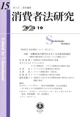 第15号は、特集「消費者法の現代化をめぐる比較法的検討」として、EU、ドイツ、フランス、アメリカの消費者法の現代化状況を紹介・検討し、日本の消費者法制の今後について考究する(中田、カライスコス、寺川、大澤、川和、鹿野)。翻訳2本(中田〔監訳〕・古谷〔訳〕)も掲載。時代のニーズに合わせ益々充実の消費者法研究第15号。