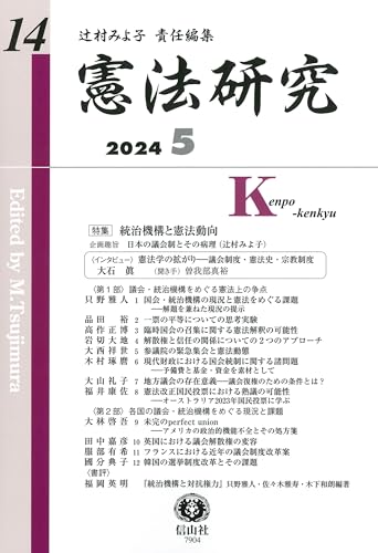 第14号は「統治機構と憲法動向」を総合テーマとし、大石眞教授へのインタビュー(聞き手:曽我部)「憲法学の拡がり―議会制度・憲法史・宗教制度」を皮切りに、第1部は「議会・統治機構をめぐる憲法上の争点」は8論文(只野、品田、高作、岩切、大西、木村、大山、福井)、第2部は「各国の議会・統治機構をめぐる現況と課題」は4論文(大林、田中、服部、國分)。書評(福岡)も掲載。