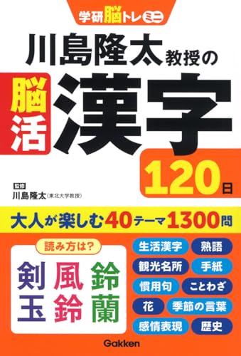 脳トレの第一人者、川島隆太教授の漢字脳トレ。脳を活性化させる漢字問題を120日分掲載。学校で習った基礎漢字やことわざ・四字熟語・故事成語・慣用句のほか、季節・地名・動物に関する常識漢字など、毎日楽しみながら脳を活性化する。