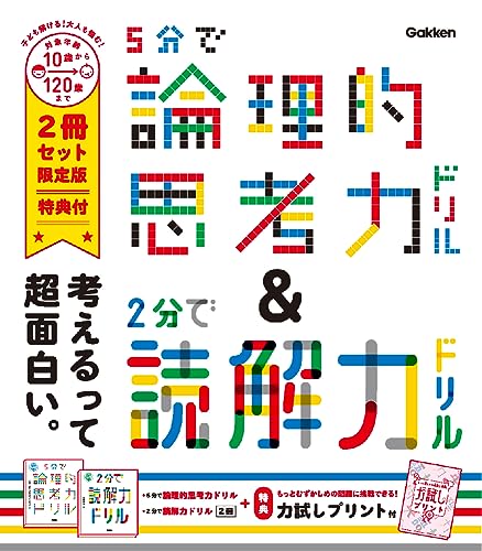 『5分で論理的思考力ドリル』と『2分で読解力ドリル』を2冊セットにした限定版! 論理的思考力と読解力が楽しく身につきます。さらに、きみの論理的思考力と英語力を試せる問題を収録した、特典『力試しプリント』つき。