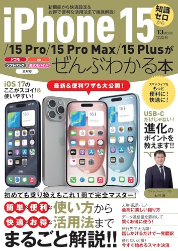 最新のiPhone15、15 Plus、15 Pro、15 Pro Maxの4機種が発売されました! 本誌では、基本操作はもちろん、標準アプリの使い方から、キャッシュレス決済、データの共有やバッテリーの無駄な消費を防ぐ方法、便利アプリの紹介など、快適に使うための活用方法まで、まるごと解説します。なお、iPhone 15シリーズだけでなく、iOS 17を搭載するすべてのiPhoneに対応した解説書です!