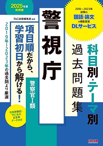受験先ごとの択一対策を強力にバックアップ!科目別・出題テーマ別の配列なので解きやすい! 公務員試験は幅広く対策し、いくつかの試験を併願するのがセオリーですが、試験問題を眺めてみると、受験先ごとにだいぶ違った出題傾向にあることがわかります。ある程度志望先が固まってきたら、受験先ごとの過去問演習で出題傾向を理解する必要があります。この問題集では、警視庁(警察官Ⅰ類)採用試験について、過去10回分の択一試験から精選した問題を科目別・出題テーマ別に並べて掲載し、詳細な解説を設けています。インプット学習と並行して、頭に入れた範囲の過去問演習にも、直前期に集中的に過去問を解くのにも使えます。★本書の特長①TAC生の受験時のデータを公開!全国のTAC生が実際の試験で解答した内容についての報告をもとに、択一試験の一部について「TAC生の正答率」を掲載しています。これを見ると、正答率の高い問題なら本試験でも必ず得点すべき基本問題だとわかりますし、正答率が低い問題ならあまり対策に時間を費やすべき分野ではないというヒントも得られるかもしれません。★本書の特長②合格体験記を収録!この試験の合格者に取材し、合格体験記を掲載しています。志望のきっかけや学習のアドバイス、苦手科目の克服法や本番当日を迎えるにあたっての注意点など、志望者の気になる情報が最新の受験経験を踏まえて語られていますので、ぜひご活用ください。★本書の特長③2023年の最新過去問を巻末に収録!最新の2023年の過去問だけは、巻末に抜き取り式冊子として収録し、科目別・出題テーマ別ではなく、本試験実施時の問題配列のまま掲載しています。直前期に、模擬試験のような感覚で時間を図って取り組むのもよいでしょう。★本書の特長④【購入者特典】過去の記述試験の模範解答をDL可能!本書の購入者特典として、過去の記述試験の問題・模範答案をWeb上でDLできます。記述試験は多くの合格答案に触れるのが合格への近道ですから、ぜひご利用ください。