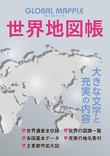 ●デザインと実用性にこだわった世界地図A4サイズで字が大きく見やすい地図帳です。主要都市については都市拡大図を収録し、世界各地の街並みを眺めることができます。地図の他にも、各国の面積や人口、宗教、民族などがわかる基本データ、国旗一覧なども収録しています。また、ユネスコの全世界遺産を地図上に掲載し、リストも収録するなど、充実した内容となっています。●世界の変化に対応する情報の鮮度日本国内と同様に、世界各国でも日々新しい道や鉄道が作られ、市町村合併や市町村名の変更が行われています。目まぐるしく変化する世界に対応すべく、日々情報収集に努めています。