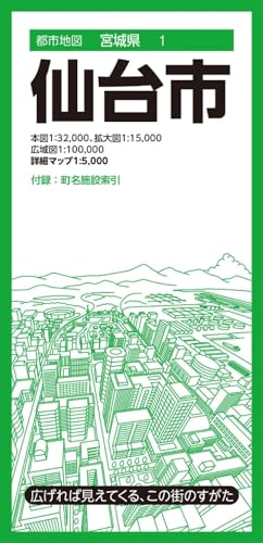 『都市地図』は、広げて見るシートタイプの都市詳細地図です。全国約1000市町村をラインナップしています。日常利用に幅広く応える、お役立ち情報を満載しています。●商品概要本図1:32,000、拡大図1:15,000、広域図1:100,000、詳細マップ1:5,000仙台市の主要部を本図1:32,000図で、全域を広域図1:100,000図で収録しています。仙台市の中心部を拡大図1:15,000で、また付録表面にはさらに詳しい1:5,000図を収録しています。付録にて町名及び市役所や官公署ほか生活に便利な施設の索引を掲載しています。●サイズ商品のサイズ109.1×78.8×0.01cmパッケージのサイズ10.3×21.3×1.45cm●シリーズ特長・広げれば見えてくる、街のすがた1枚の大判紙で市町村の姿が一目でわかり、日々の暮らしに役立つ情報や街の特徴を表現した市町村案内地図です。・街の基本情報を忠実に表現道路や鉄道、住所、公共施設、商業施設、自然地形など地図としての基本情報を忠実に表現。コンビニやファストフード、ガソリンスタンドなどはロゴマークを記号化することで直観的に識別できるようにしています。・町名施設索引付き町域で色分けされた地図と町名索引で、場所の検索も容易です。・様々な利用シーン営業やエリアマーケティング、不動産業務、分布図作成、地域の防犯・防災マップ作成、入学祝いや引越し祝いの贈答品に