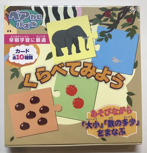 早期学習に最適な、かわいいパズルです。2枚を組み合せるパズルが20枚入っています。「大きい方はどっち?」「少ない方はどっち?」など、お子さまと一緒に遊ぶことで、「大小の比較」「数の多少の比較」という、「客観的に比べる」能力を養います。コミュニケーション能力はもちろん、色や形の認識力が鍛えられます。