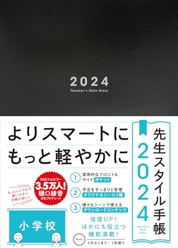 先生スタイル手帳は、小学校の先生のための、スケジュール管理&日々の記録ができる、教師用手帳です。SNSフォロワー3.5万人の樋口綾香先生監修のもと、デザインにこだわり「さらに」シンプルで使いやすい手帳になりました!◎1年間のパートナーとしてふさわしい上質で使いやすい手帳!土日祝が分かりやすい2色刷。月毎に「マンスリー」→「ウィークリー」の順に配置し、月間予定を見ながら週間予定も立てやすい設計に。広めで自由度の高いメモ欄は、たくさん書き込んだり付箋も貼れます!巻頭と巻末には、厚めの紙でできた「ピタペタシート」があります。年間を通じて、何度も見返すプリント類などを貼ると便利です。ダウンロードコンテンツや学校の配付物、付箋に書いたメモなど、ピタペタ貼って自分だけの手帳にすることができます。今年はバージョンアップして時間割欄が2つになりました。直接時間割を書き込むことができます。学校で配付された時間割表をピタペタシートの見返し部分に貼ると、時間割を確認しながら週の予定を書き込めるのでとても便利です。印刷しても、タブレット端末上でデータとしても使えるダウンロードコンテンツを用意しました。今年度は、新たなデザインやイラストデータを追加して、さらに自分の好みやシーンに合わせて使えるようにしています。■ 名簿、部活動月間予定表などのExcelデータ■ 会議などに使える記録シートやバス座席表などのPDFデータ■ メッセージカード、吹出し、飾り罫など種類が豊富なイラストテンプレートイラストテンプレートには「授業に役立つ便利グッズ」を追加しています。先生が授業で必要な資料に使うのはもちろん、クラスの子どものタブレット端末に配付して活用もしていただけます(学校全体での共用はお控えください)。用途に合わせて、手軽にイラストテンプレートを活用してください。