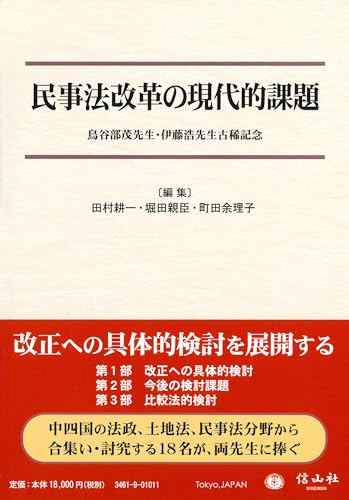 第1部「改正への具体的検討」(平山、上河内、石口、田村、大島、町田、永岩)、第2部「今後の検討課題」(一藁、草地、岩元、金、知念、中曽)、第3部「比較法的検討」(堀田、古屋、金、徐、孟)。中四国の法政、土地法、民事法分野から18名が合集い・討究する。民事法改正への具体的検討。