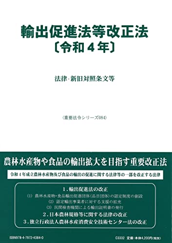農林水産物や食品の輸出拡大を目指す重要改正法「農林水産物及び食品の輸出の促進に関する法律等の一部を改正する法律」(令和4年5月25日法律第49号)を収載。【主な改正内容:1)輸出促進法の改正(1.農林水産物・食品輸出促進団体(品目団体)の認定制度の創設/2.認定輸出事業者に対する支援の拡充/3.民間検査機関による輸出証明書の発行)、2)日本農林規格等に関する法律の改正、3)独立行政法人農林水産消費安全技術センター法の改正】