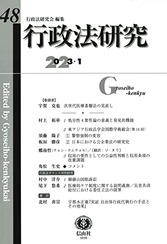 48号の〈巻頭言〉は、「次世代医療基盤法の見直し」(宇賀)。論説は、「処分性4 要件論の意義と発見的機能」(多賀谷)、「東アジア行政法学会国際学術総会(第14回)」の研究報告2本(須藤、板垣)、「収 用の要件としての公益性判断と収用条項の改憲課題」(チョン)とそのコメント(角松)、判例研究2本(村中、尾下)、北村による書評1本を収録。