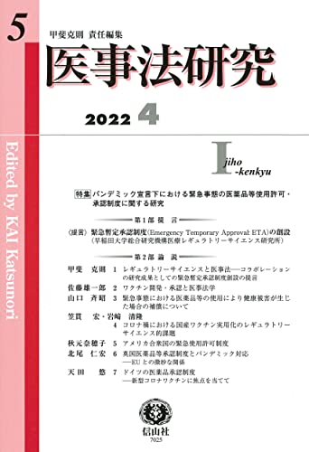 第5号は、特集「パンデミック宣言下における緊急事態の医薬品等使用許可・承認制度に関する研究」として、第1部は、〈提言〉「緊急暫定承認制度の創設」(早稲田大学 総合研究機構医療レギュラトリーサイエンス研究所)。第2部は、各専門家の視点から重要な最新の7論文(甲斐、佐藤、山口、笠貫=岩﨑、秋元、北尾、天田)を掲載。最新テーマで迫るますます充実の研究誌。