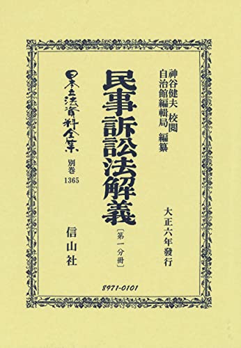 大正期に実務家のために編まれた民事訴訟法の注釈書。条文ごとに、関係法令、学説、行政実例、判決例を採録する。神谷健夫校閲・自治館編輯局編纂、1917(大正6)年、自治館出版発行。第一分冊は「緒論」から第二編「第一審ノ訴訟手續」まで、第二分冊は第三編「上訴」以降を収録。