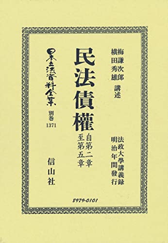 法政大学における債権各論の講義録。明治年間発行(奥付を欠くため正確な発行年は不詳)。第2章第1節(契約総則)・第3章から第5章まで(事務管理・不当利得・不法行為)は梅謙次郞(1860-1910)が、第2章第2節から第14節まで(契約各論)は橫田秀雄(1862-1938)が担当した。