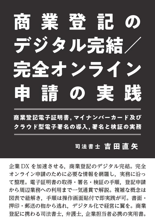 カナ:ショウギョウ トウキ ノ デジタル カンケツ カンゼン オンライン シンセイ ノ ジッセン : ショウギョウ トウキ デンシ ショウメイショ マイ ナンバー カード オヨビ クラウドガタ デンシ ショメイ ノ ドウニュウ ショメイ ト ケンショウ ノ ジツム