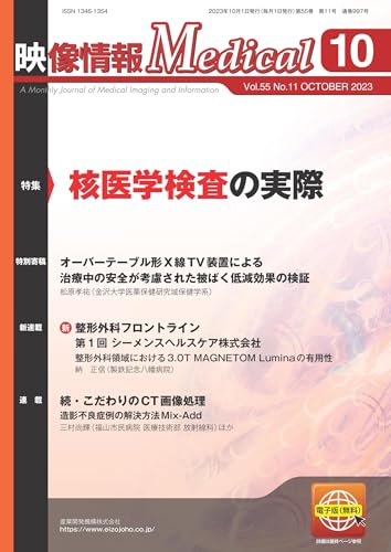 特集:『核医学検査の実際』幅広い用途を求められる核医学診療において重要視される核医学検査の定量化など、診断や治療方針の決定により有用な情報を与える核医学検査にスポットを当てます。【特別寄稿】オーバーテーブル形X線TV装置による治療中の安全が考慮された被ばく低減効果の検証松原孝祐(金沢大学 医薬保健研究域保健学系)【新連載】整形外科フロントライン本連載では装置メーカ各社に、編集部からの質問に答えていただく形で、開発背景や設計思想、機能特長などを示していただく。加えて、当該装置の機能が実際の医療現場でどのように活用されいるかの最新状況を、整形外科のスペシャリストである医師・技師の先生方に解説いただく。